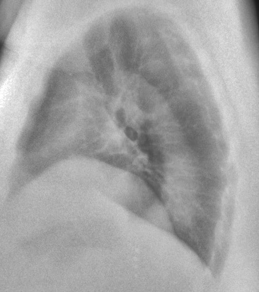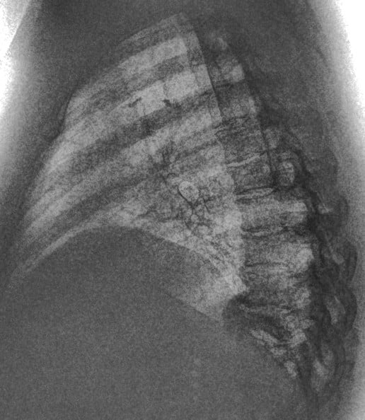 This 67-year old female patient presented to the ER with shortness of breath, in conjunction with chronic pain in her posterior thoracic region upon taking a large breath in. The reading radiologist noticed a suspicious mass-like opacity in the Lateral view. The radiologist stated that, thanks to the DE images, they could they tell the opacity wasn’t a lung mass, but instead far less concerning bony outcroppings from the thoracic vertebrae.